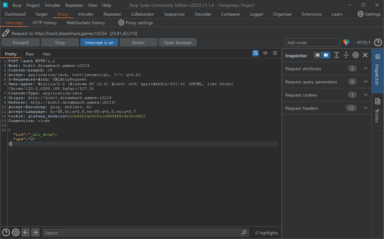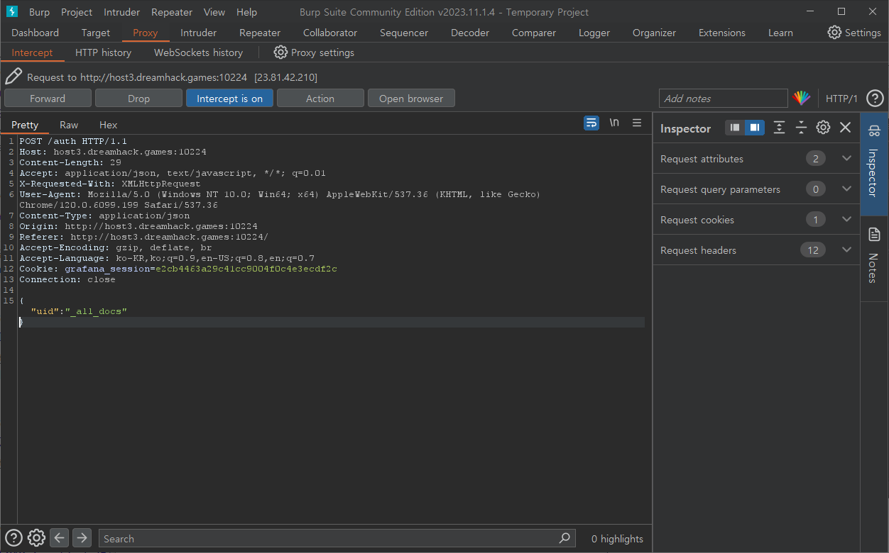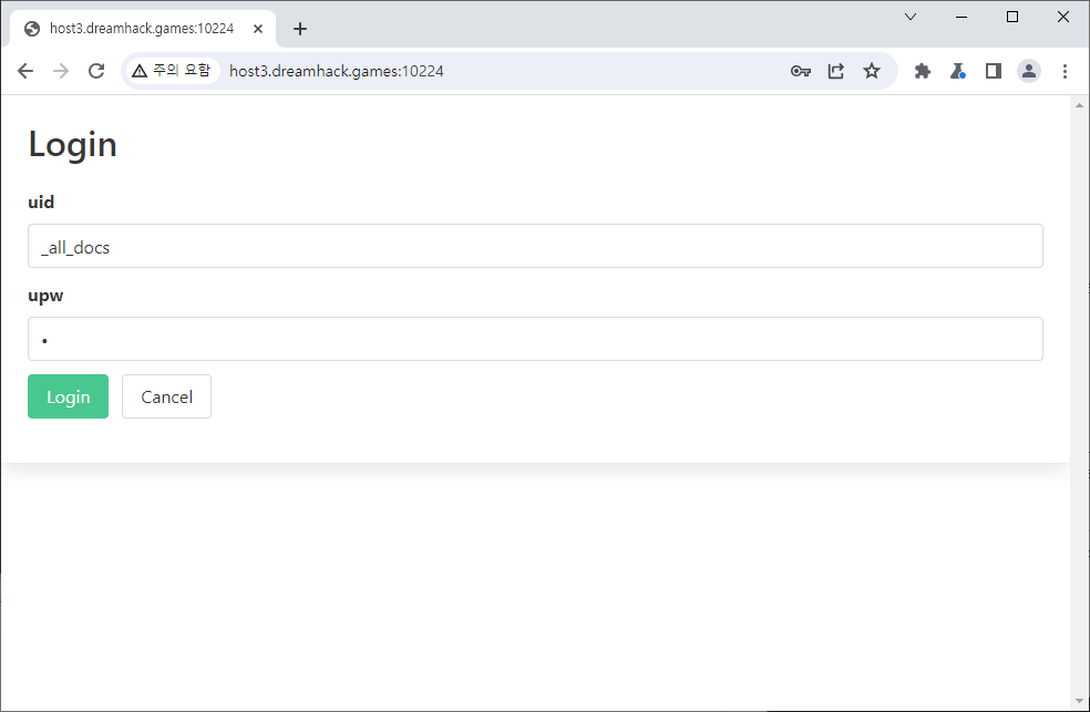 intercept on을 해주고 uid에는 _all_docs, upw에는 아무 값이나 넣고 login을 누릅니다.
