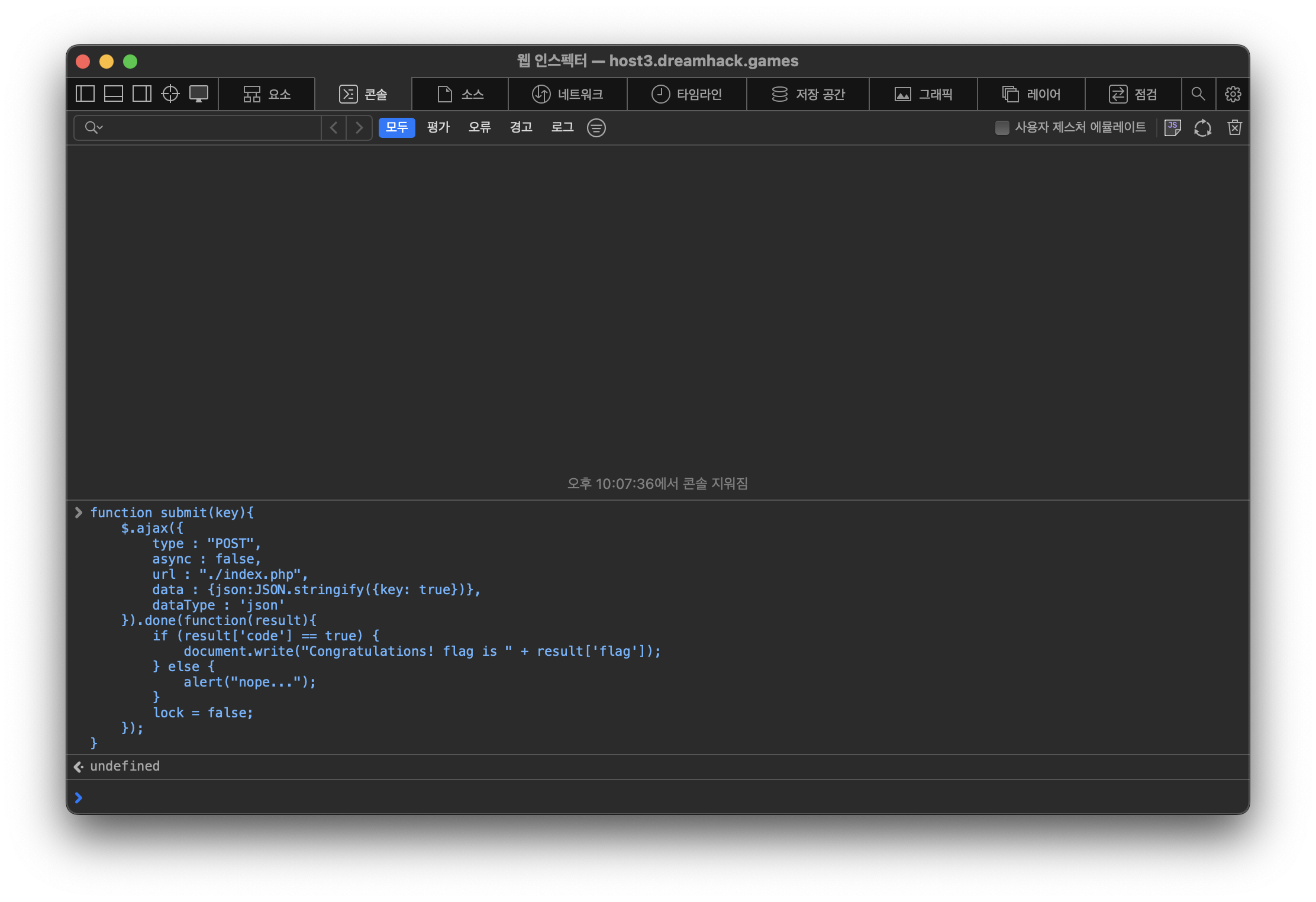 코드를 보면 일단 form에 뭔가를 적으면 submit_check함수가 입력값이 비었는지, 그리고 중복요청을 막는 코드가 실행됩니다. 입력값이 있다면 submit함수가 실행되어 {key: 입력값}의 json을 post 요청으로 보냅니다. 입력값이 gen_key함수의 결과와 같다면 flag를 보여주네요.