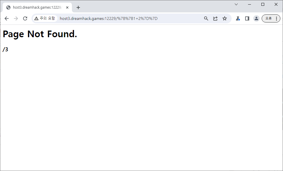 request.path를 그대로 넣어버리기 때문에 ssti 취약점이 발생합니다. 앞에서 처럼 {{1+2}}가 작동하는지 확인하기 위해 /{{1+2}} 를 입력해 보면