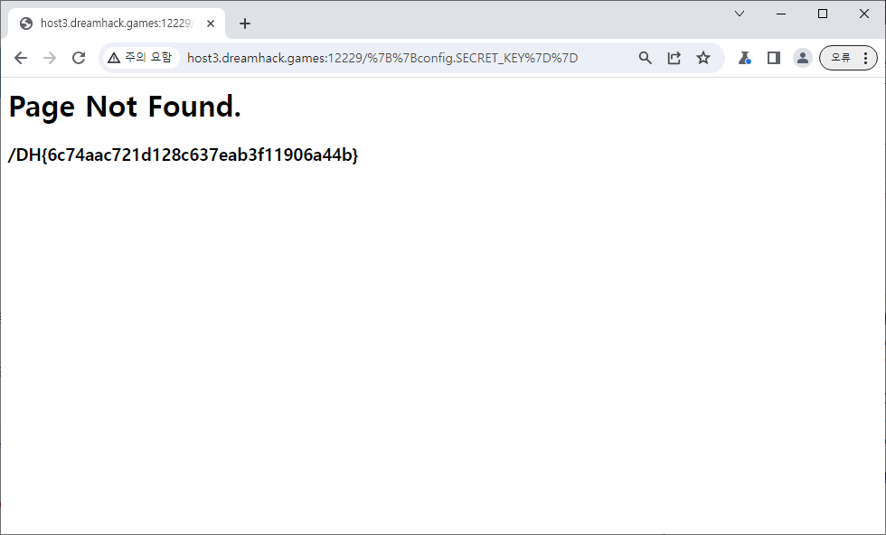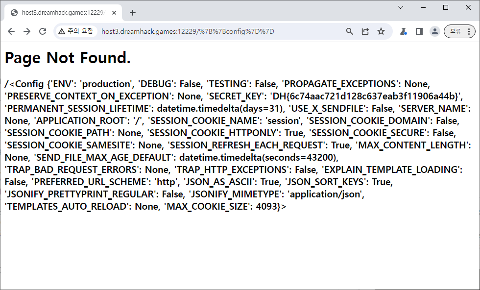 이렇게 SECRET_KEY가 출력됩니다. 만약 SECRET_KEY만 얻고 싶다면 {{config.SECRET_KEY}}를 입력하면 됩니다.