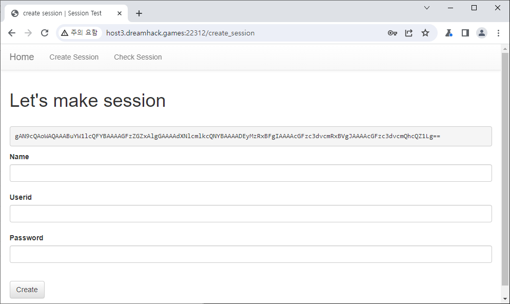 create_session 페이지는 name, userid, password를 post로 받아서 dict로 만들고 그걸 base64로 인코딩해서 보여주는듯 합니다.