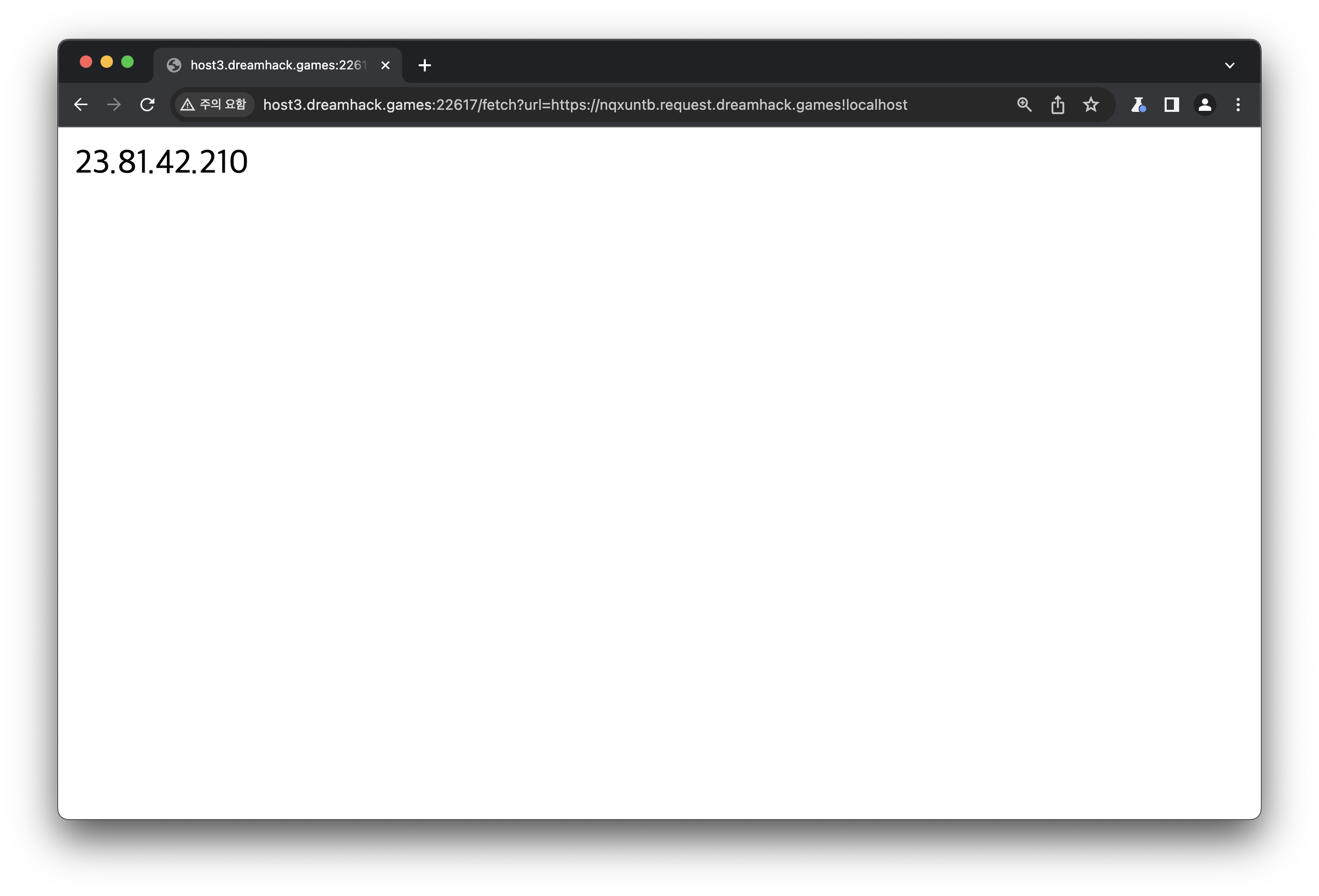 문제에서 host를 검사할 때 &&을 쓰고 있어서 뭐라도 false로 만들어주면 우회가 가능합니다. 이번에도 드림핵 툴즈를 사용했습니다. /fetch?url=https://nqxuntb.request.dreamhack.games!localhost(*를 사용해도 됨)로 접속을 해보니