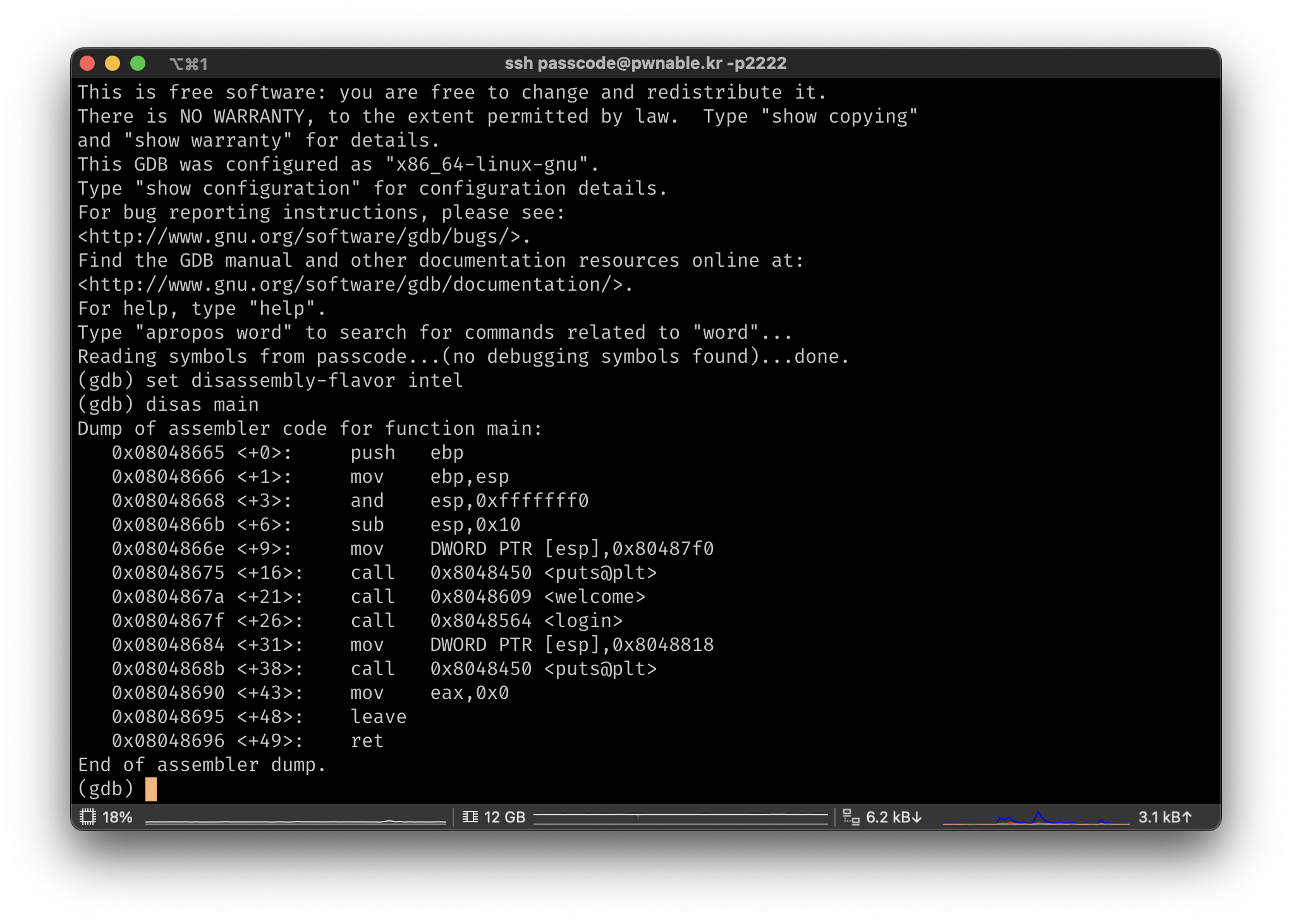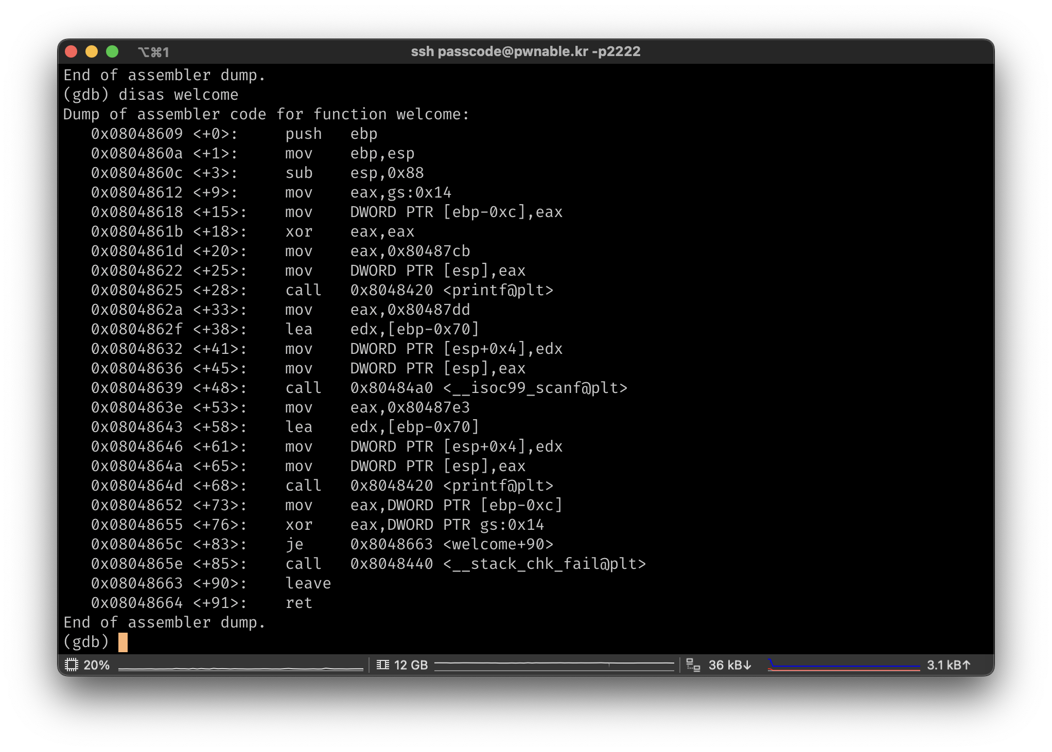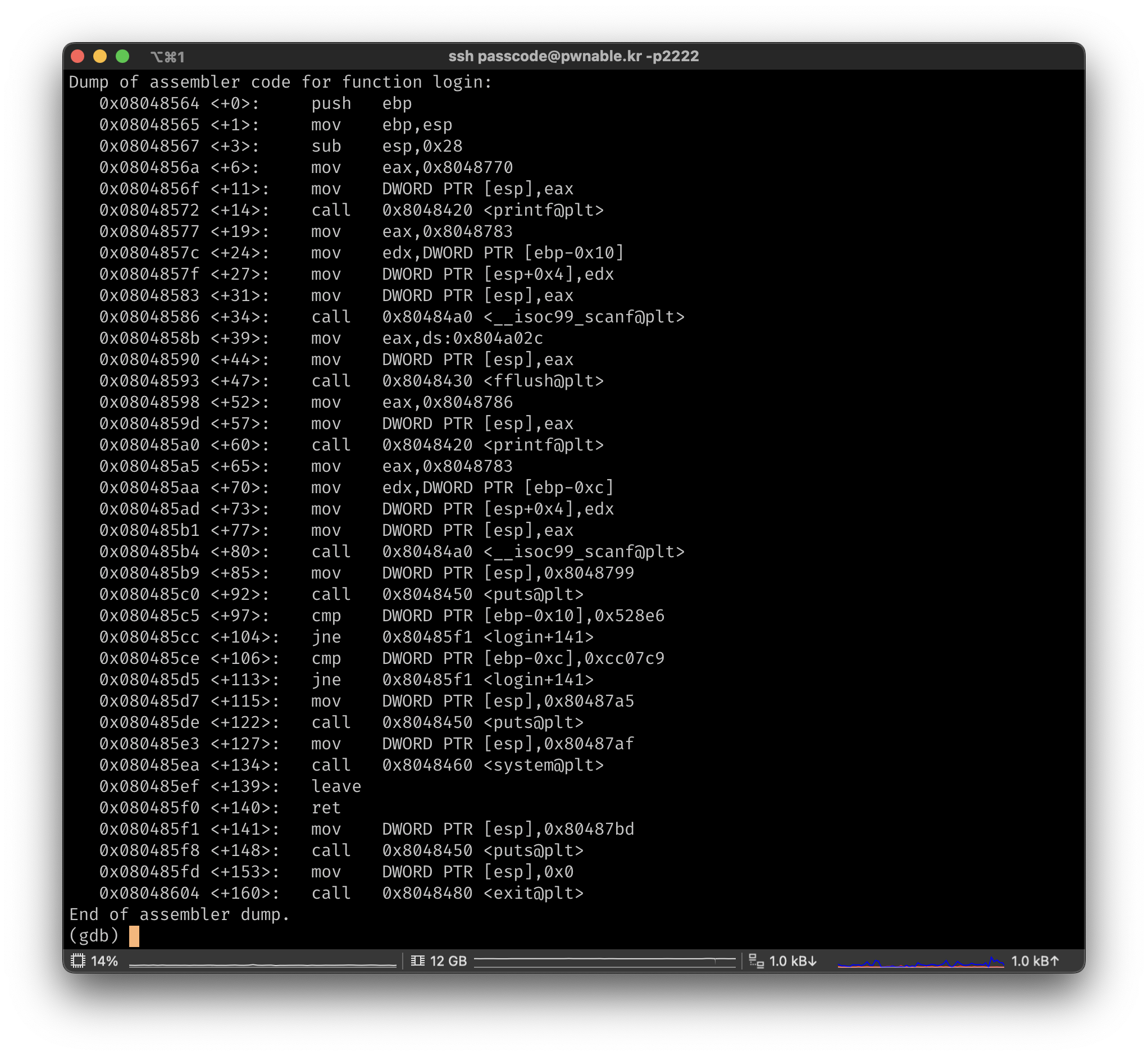 passcode1는 ebp-0x10(ebp-16)에 존재하고, passcode2는 ebp-0xc(ebp-12)에 존재하고 있네요.