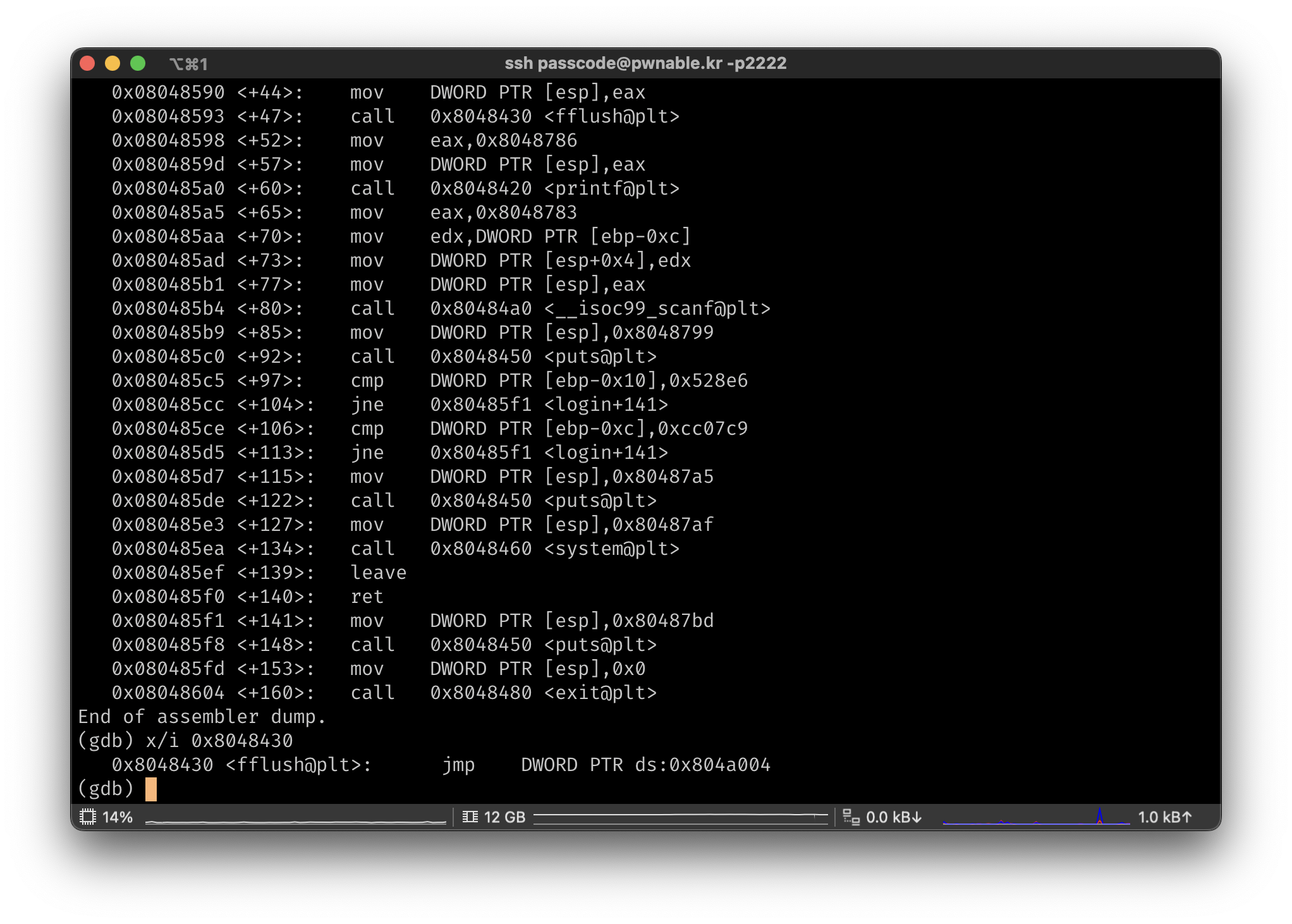 따라서 passcode1에 0x804a004를 넣은 상태로 scanf에서 주소를 입력받으면 scanf가 끝나고 fflush함수가 실행되면서 입력받은 주소의 코드로 jmp하게 됩니다.