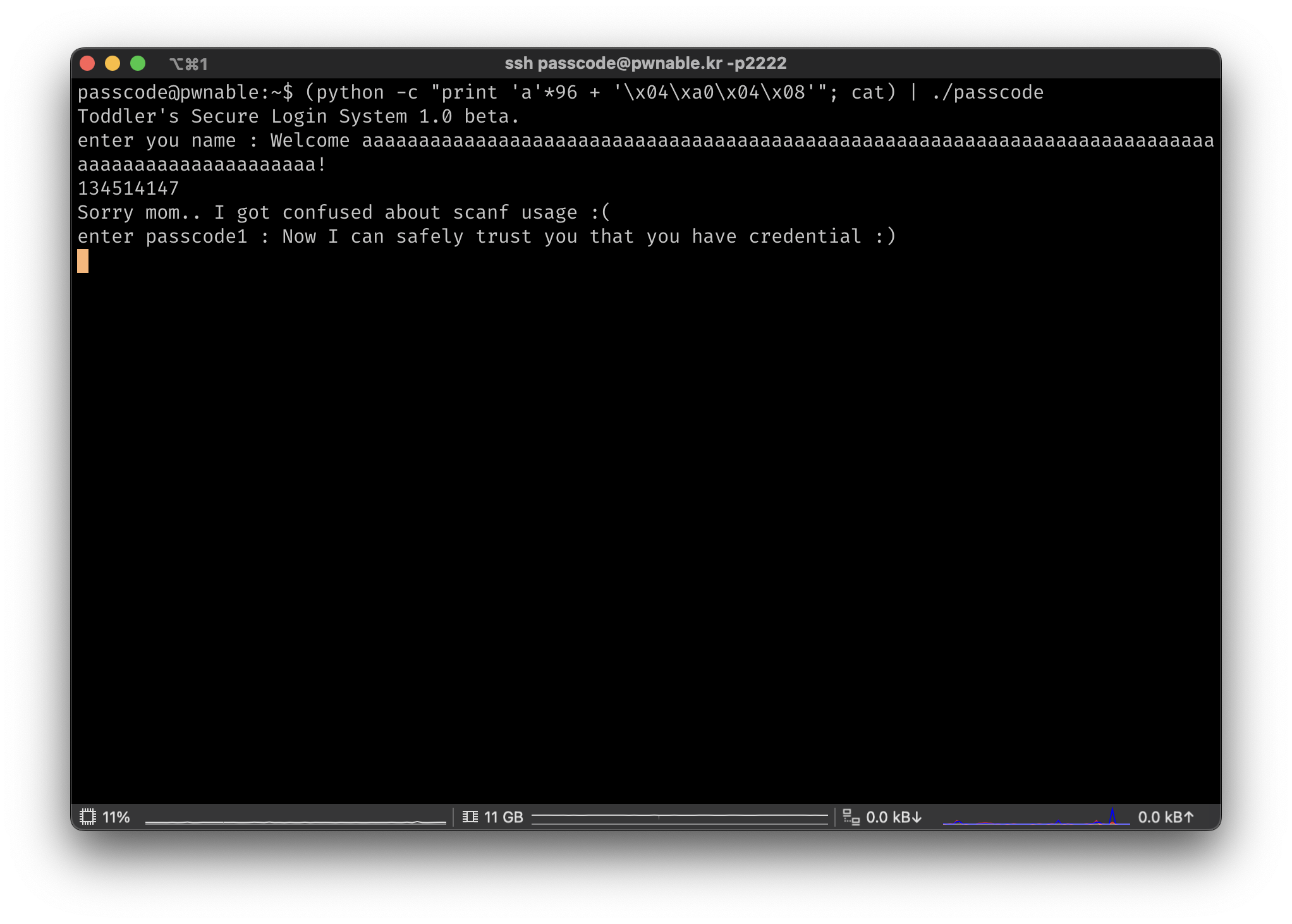 여기서 welcome의 name의 범위를 생각해보면 마지막 4바이트가 passcode1과 같은 주소를 쓰고 있네요. 그렇다면 96바이트의 더미 데이터와 조작을 원하는 주소 4바이트를 name의 입력으로 사용한다면 passcode1입력을 받을때 원하는 데이터(4바이트)를 원하는 주소에 넣을 수 있게 됩니다.