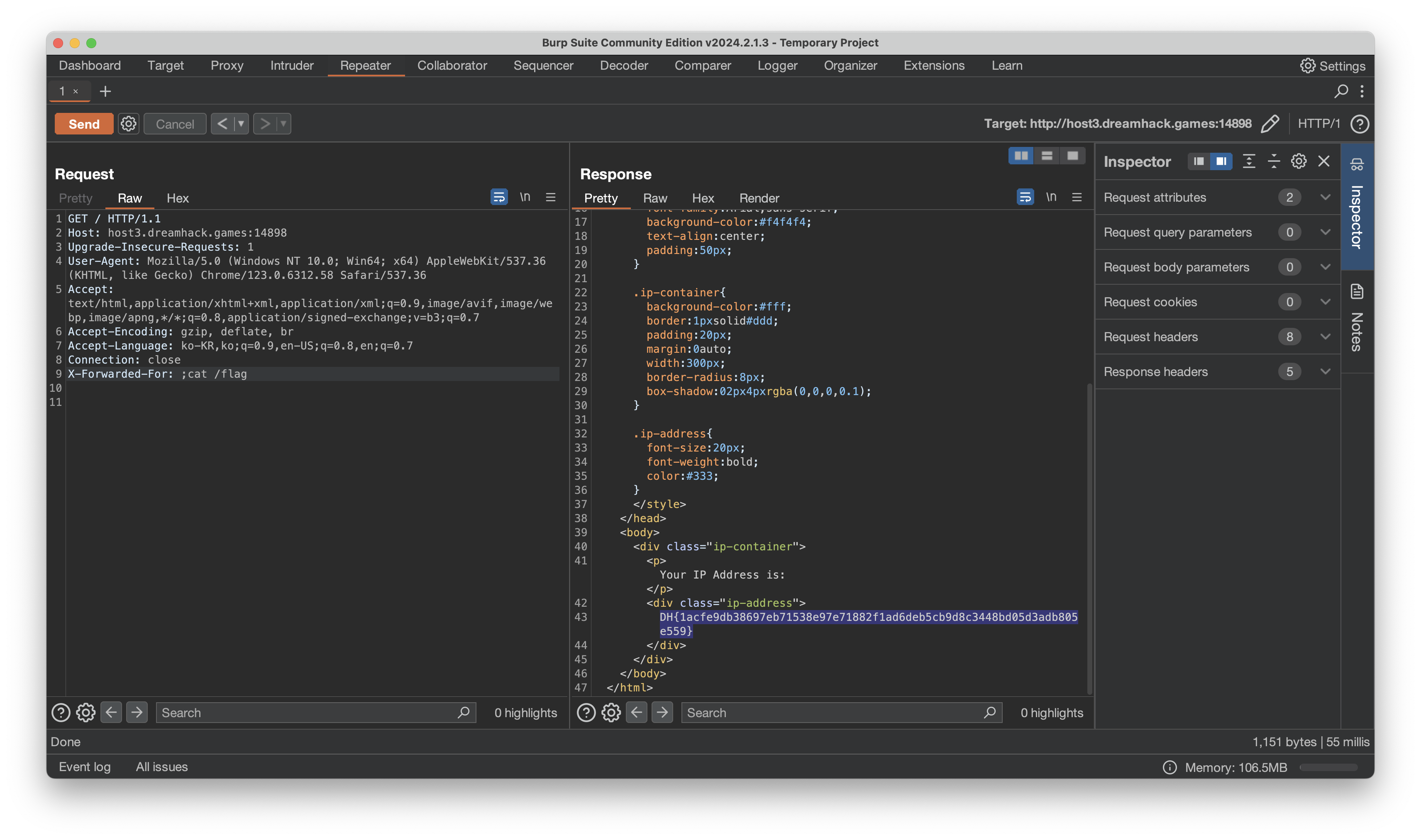 그렇다면 X-Forwarded-For헤더를 이용해 user_ip를 바꿀 수 있습니다. 우리는 /flag파일을 읽어야 하므로 X-Forwarded-For: ;cat /flag를 포함해서 요청을 보내게 되면 request.access_route[0]에 조작된 헤더의 값이 들어가고 이는 user_ip가 됩니다.