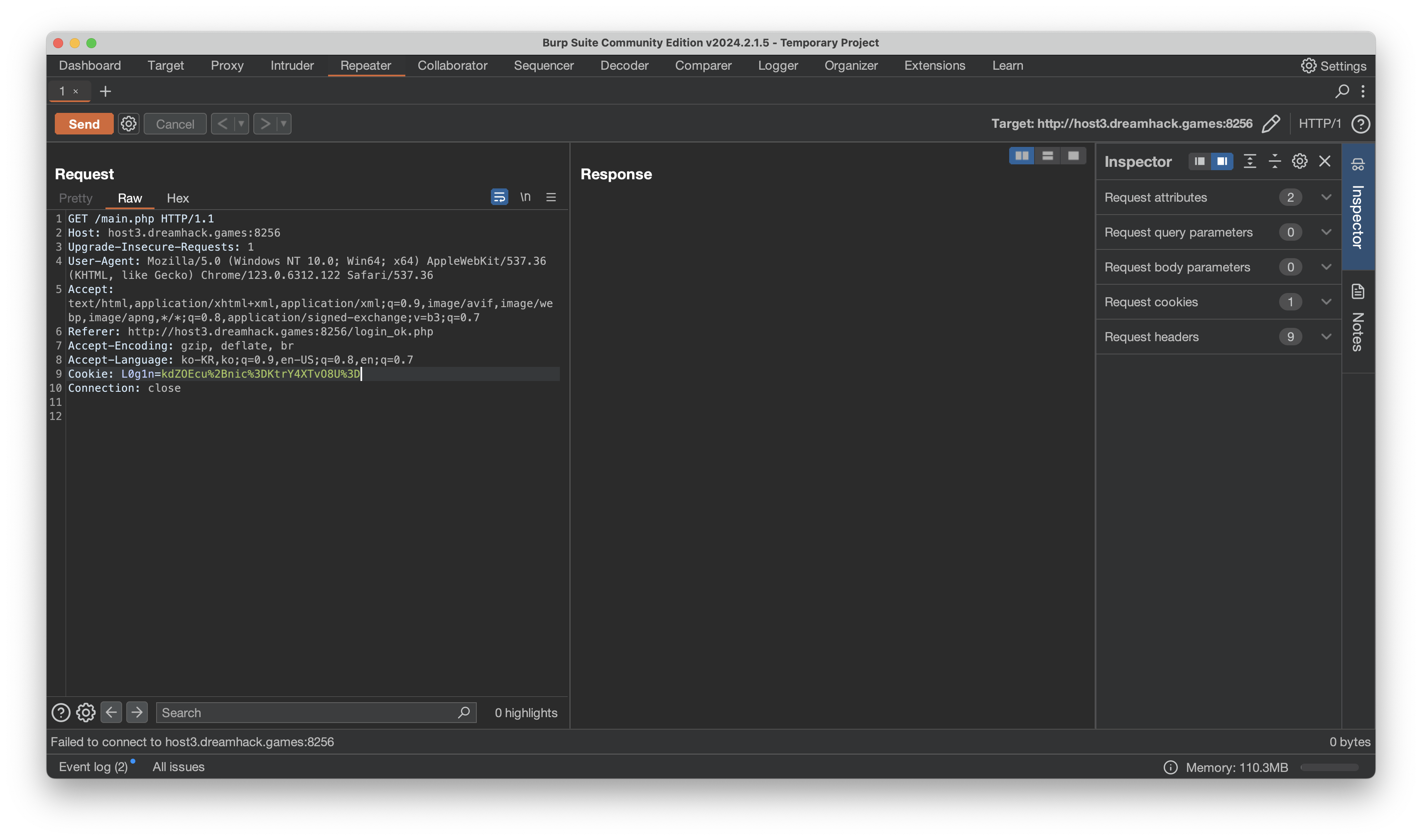 burp suite로 확인해보니 쿠키로 LOg1n=l8dGC9G%2Bnic%3DKtrY4XTvO8U%3D라는 수상한 값이 있습니다. url decode를 해보면l8dGC9G+nic=KtrY4XTvO8U=라는 값입니다.