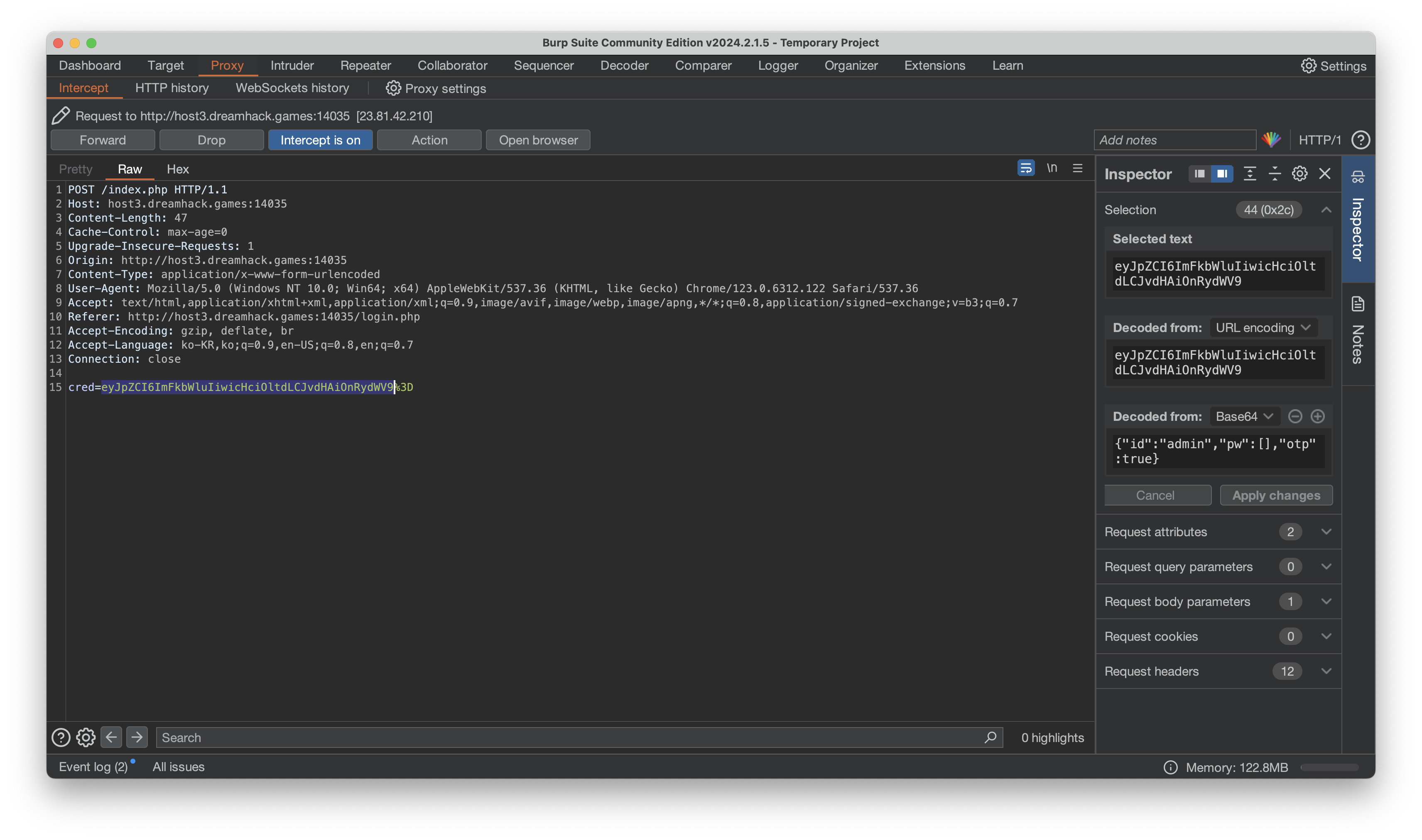 이렇게 cred이라는 값이 전달되고 있습니다. 이걸 디코딩 해보면 입력값에 대한 json이 나옵니다.