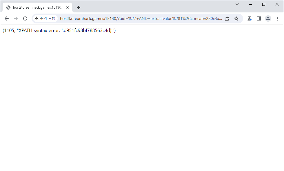 이때 extractvalue 함수로 XPath로 유효하지 않은 문자열을 넘겨준다면 이 값을 그대로 에러메세지에 출력합니다. 따라서 여기서 서브쿼리를 실행하고 결과를 extractvalue함수로 넣어준다면 에러메세지로 서브쿼리의 실행결과를 받아올 수 있습니다.