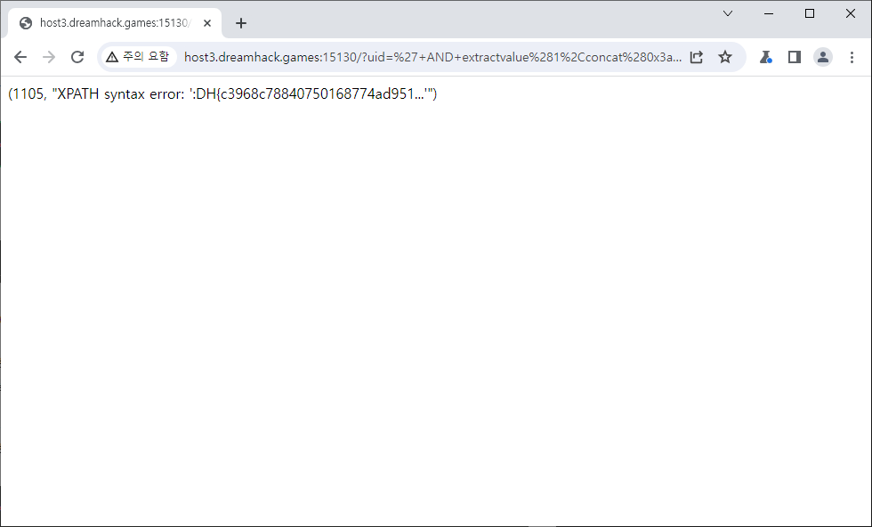 이때 extractvalue 함수로 XPath로 유효하지 않은 문자열을 넘겨준다면 이 값을 그대로 에러메세지에 출력합니다. 따라서 여기서 서브쿼리를 실행하고 결과를 extractvalue함수로 넣어준다면 에러메세지로 서브쿼리의 실행결과를 받아올 수 있습니다.